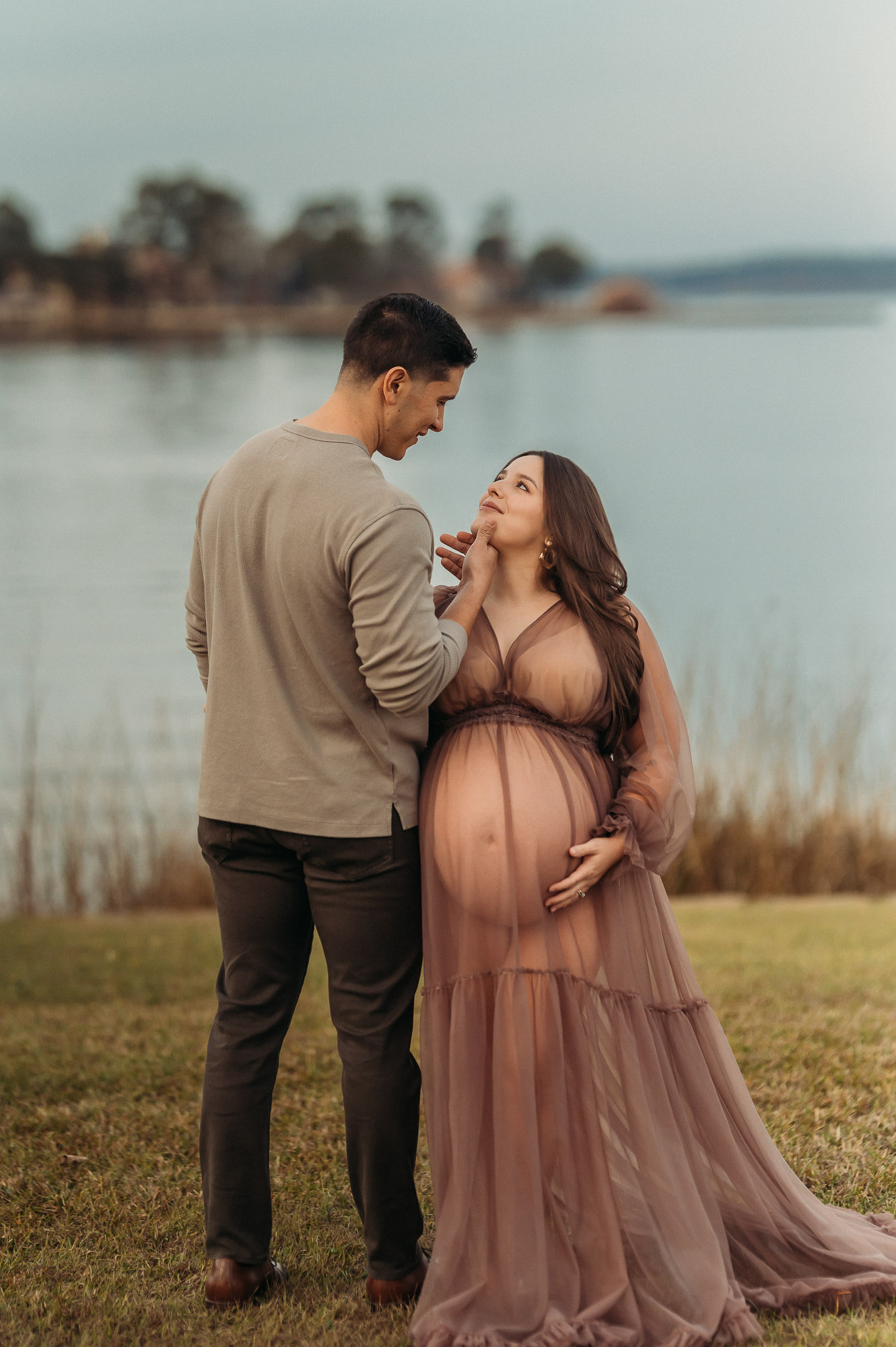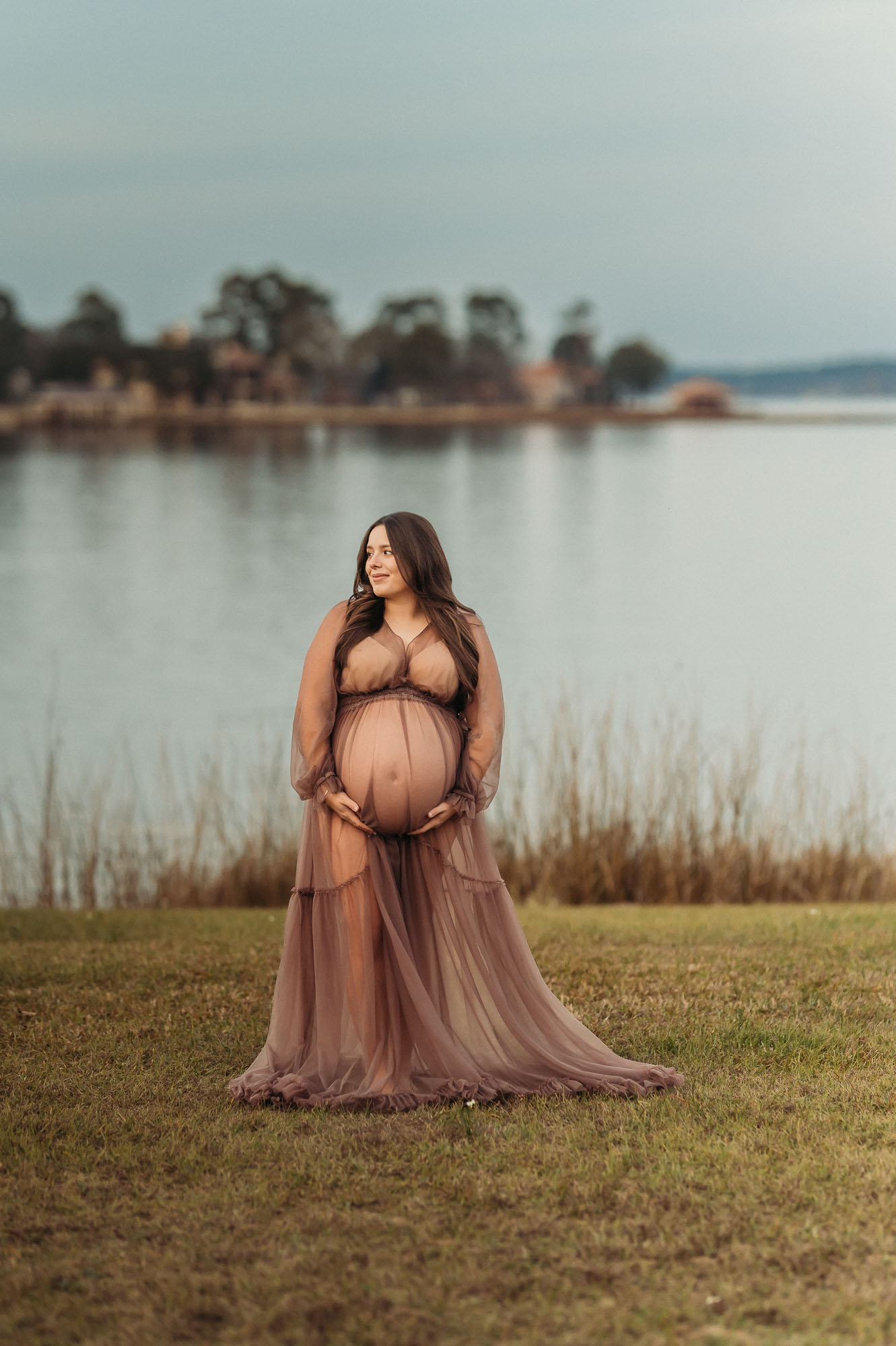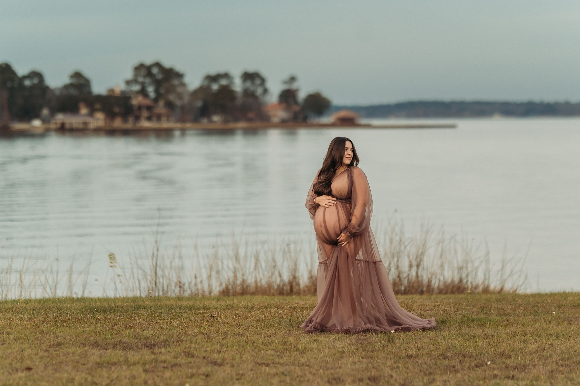 Choosing an outdoor location with open space and water created a calm, natural setting for this maternity session. The neutral tones of the landscape paired beautifully with mom’s flowing gown, allowing the focus to stay on emotion and connection. East Texas offers so many scenic backdrops, and locations like this are ideal for maternity photos that feel timeless and organic.