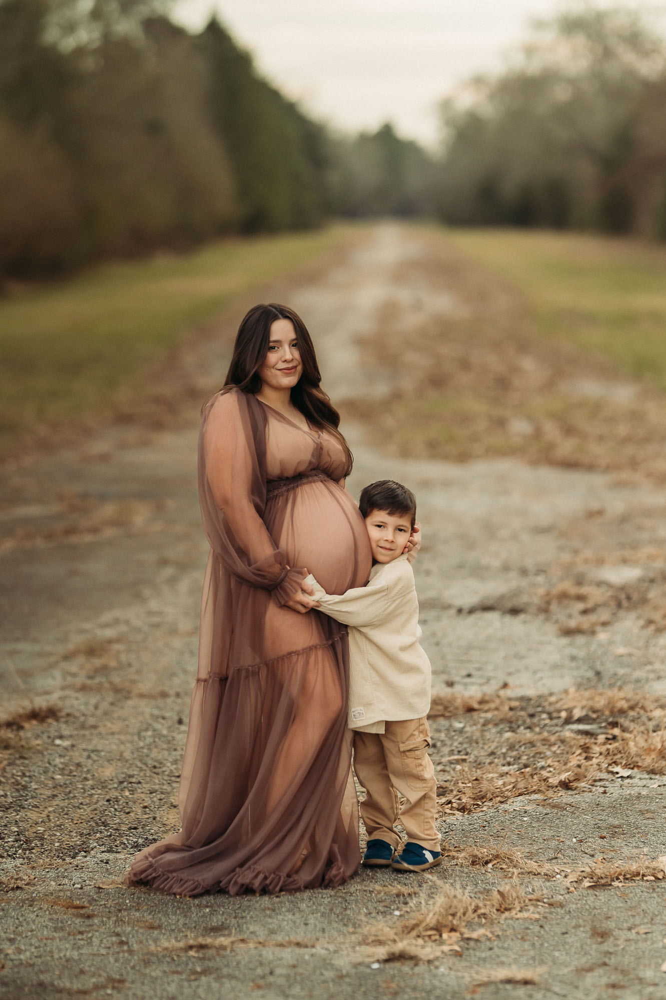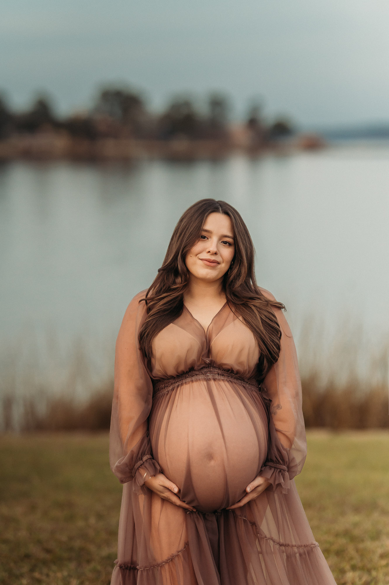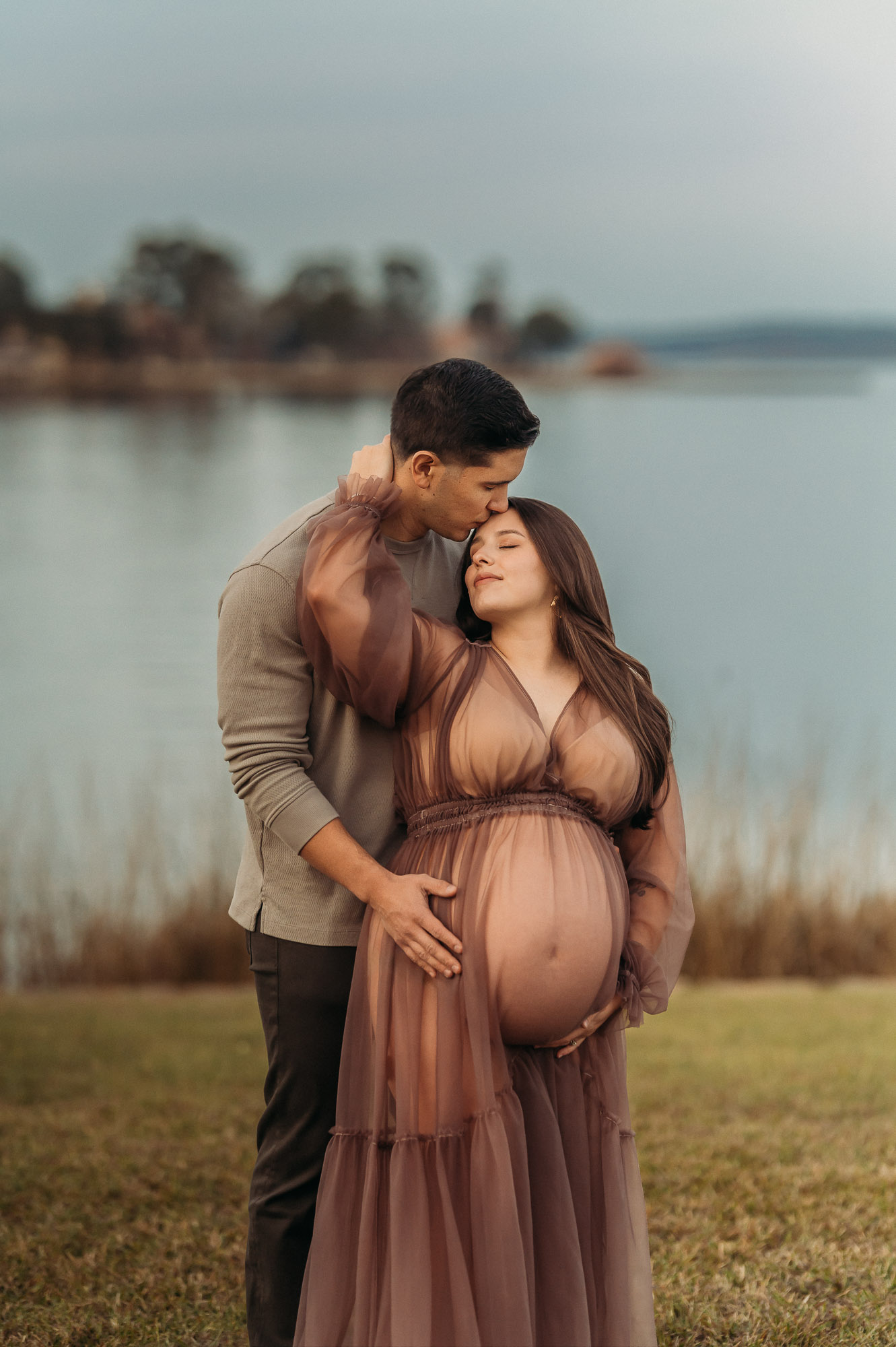 Choosing an outdoor location with open space and water created a calm, natural setting for this maternity session. The neutral tones of the landscape paired beautifully with mom’s flowing gown, allowing the focus to stay on emotion and connection. East Texas offers so many scenic backdrops, and locations like this are ideal for maternity photos that feel timeless and organic.